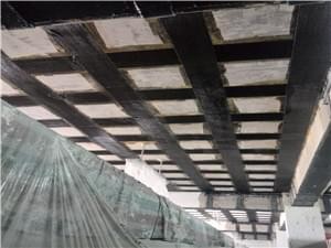 工程概况:此工程为北京市大兴区马驹桥仓库加固工程,本结构为地上两层框架结构,该建筑约建造于2012.2月,原设计单层,实际施工为两层,现因不满足使用要求,增加一层钢结构屋面,增加第三层业主将作为档案资料室,原二层顶板设计活荷载为3.5KN/㎡,档案室的使用活荷载为7KN/㎡,根据甲方提供的原结构图纸及使用要求,我们采取粘贴碳纤维加固、粘钢加固。详见施工照片: