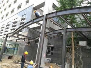 此工程为望京新增钢结构咖啡厅工程,项目位于望京阜通大街,因使用需要,需增加一个14.5米*12米的钢结构咖啡厅,结构采用钢架、外装饰采用玻璃幕加铝板。凯利恒工程承接范围包含结构的深化设计、钢结构安装、玻璃幕墙、外包铝板等。以下为现场施工照片:
