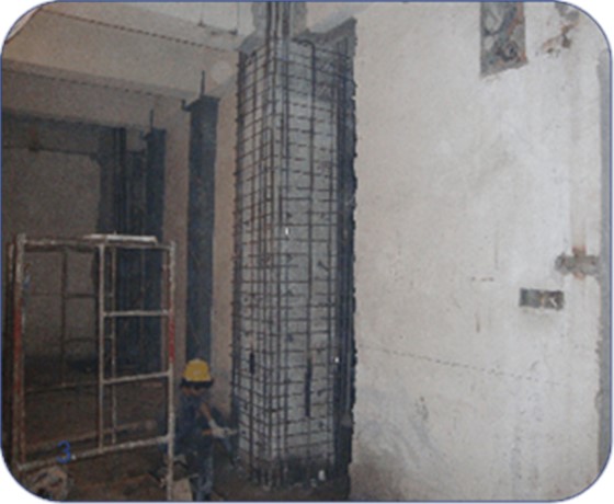 原使用功能为印刷厂厂房及办公用房,改建后为综合性会所,局部使用功能改变,新增电梯二部。原框架柱梁需加固,原框架柱截面增大,按设计要求,柱截面加大采用灌浆料进行浇筑,新开电梯门口进行粘钢加固,局部梁底粘钢加固。